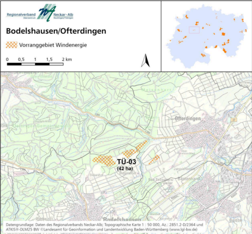 Im Gebiet in Bodelshausen zwischen dem Birkenhof, dem Burgstallhof und dem Rammert sollen auf der Gemarkung Bodelshausen/Ofterdingen 7 Windräder mit einer Höhe von je 285 m geplant werden. Im Vergleich: der Stuttgarter Fernsehturm hat eine Höhe von 217 Metern, der Rottweiler Turm 246 Meter. Das ganze Gebiet umfasst 142 ha.